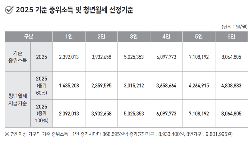 - 원가구(청년 독립가구+부모) 소득: 중위소득 100% 이하